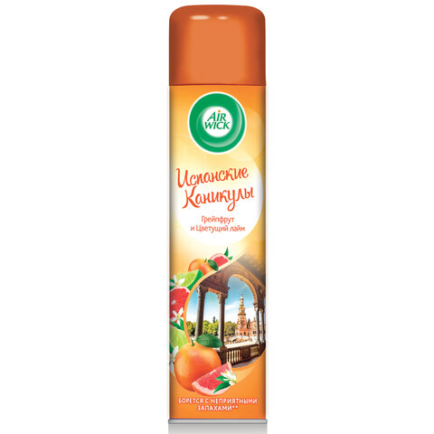 Аэрозоль-освежитель воздуха AIRWICK "Испанские каникулы" из новой коллекции "Ароматы мира" эффективно борется с неприятными запахами, создавая заряд солнечного настроения Испании с цитрусовыми ароматами грейпфрута и цветущего лайма.