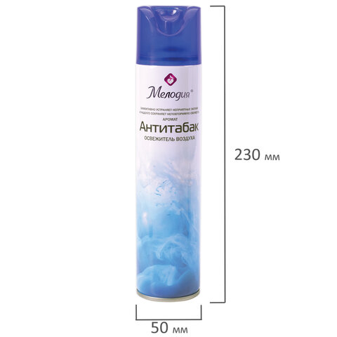 Освежитель воздуха МЕЛОДИЯ "Антитабак" быстро и эффективно устраняет неприятные запахи и освежает воздух в жилых и бытовых помещениях. Имеет приятный стойкий аромат, который надолго наполнит помещение свежестью.