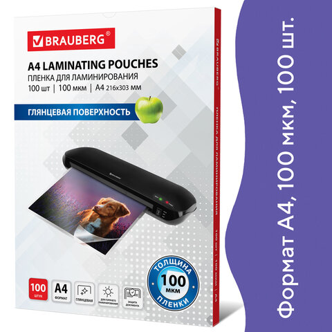 Пленки-заготовки для ламинирования А4, КОМПЛЕКТ 100 шт., 100 мкм, BRAUBERG, 530801