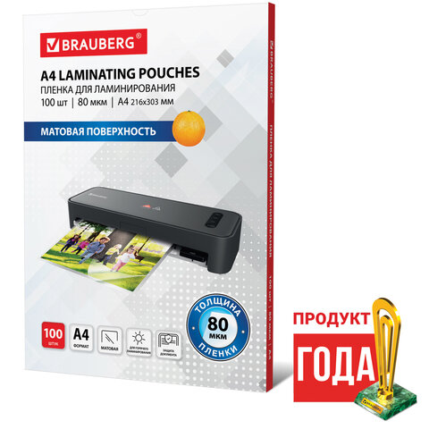 Пленки-заготовки для ламинирования А4, КОМПЛЕКТ 100 шт., 80 мкм, МАТОВАЯ, BRAUBERG, 530896
