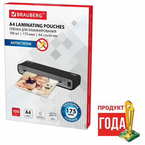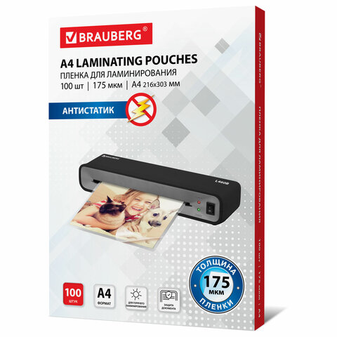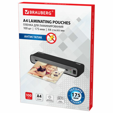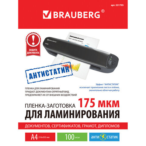 Пленки-заготовки для ламинирования АНТИСТАТИК, А4, КОМПЛЕКТ 100 шт., 175 мкм, BRAUBERG, 531795