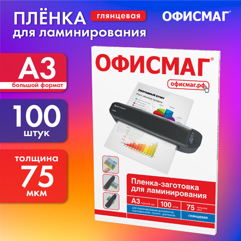 Пленки-заготовки для ламинирования БОЛЬШОГО ФОРМАТА, А3, КОМПЛЕКТ 100 шт., 75 мкм, ОФИСМАГ, 531450