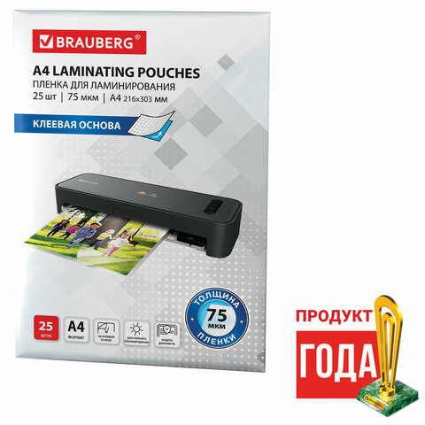 Пленки-заготовки для ламинирования НА КЛЕЕВОЙ ОСНОВЕ, А4, КОМПЛЕКТ 25 штук, 75 мкм, BRAUBERG, 531798