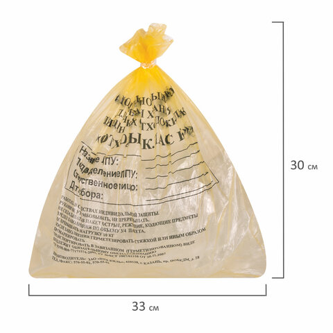 Пакеты для медицинских отходов КОМПЛЕКТ 100 шт., класс Б (желтые) 5 л, 33х30 см, 10 мкм, ПТП "Киль"