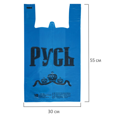Пакеты "майка", КОМПЛЕКТ 100 шт., 30+16х55 см, ПНД, "Русь", СИНИЕ, 25 мкм, ЮПЛАСТ, ЮМАЙ1072