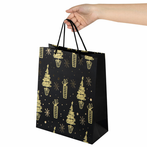 Пакет подарочный (1 штука) новогодний 26x13x32 см, ЗОЛОТАЯ СКАЗКА "Black&Gold", фольга, чёрный, 608236