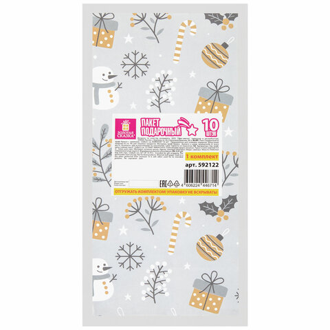 Пакет подарочный КОМПЛЕКТ 10 штук новогодний 12х8х25 см с зажимами, "Паттерн № 1", ЗОЛОТАЯ СКАЗКА, 592122