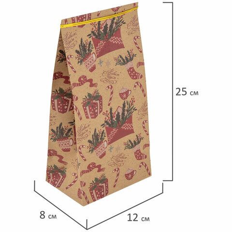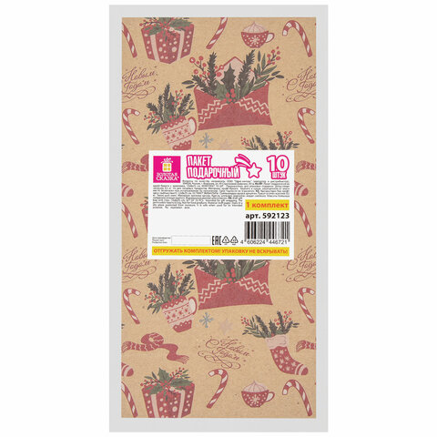 Пакет подарочный КОМПЛЕКТ 10 штук новогодний 12х8х25 см с зажимами, "Паттерн № 2", ЗОЛОТАЯ СКАЗКА, 592123