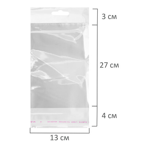 Пакеты БОПП с европодвесом, клеевым клапаном, КОМПЛЕКТ 100 штук, 13х27 + 3 + 4 см, белая подложка, BRAUBERG, 700415