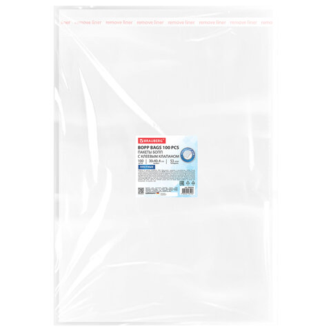 Пакеты БОПП с клеевым клапаном, КОМПЛЕКТ 100 штук, 30х40 + 4 см, 53 мкм, с усиленным швом, BRAUBERG, 700418