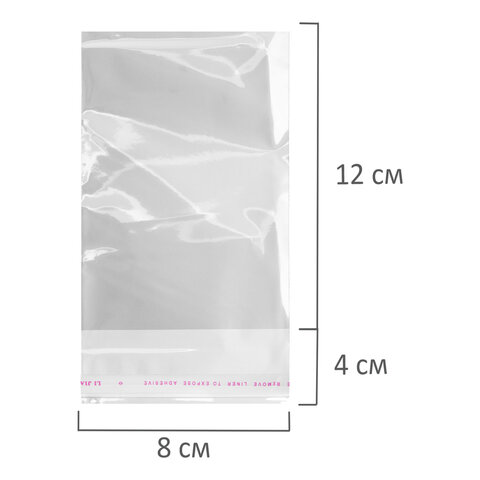 Пакеты БОПП с клеевым клапаном, КОМПЛЕКТ 100 штук, 8х12 + 4 см, 25 мкм, BRAUBERG, 700402