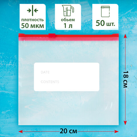 Пакеты для заморозки продуктов, 1 л, КОМПЛЕКТ 50 шт., с замком-застежкой (слайдер), LAIMA