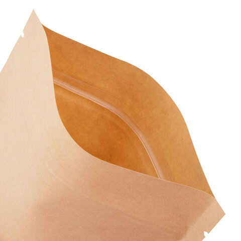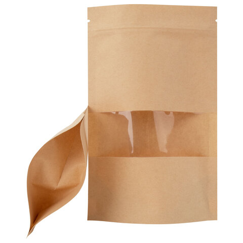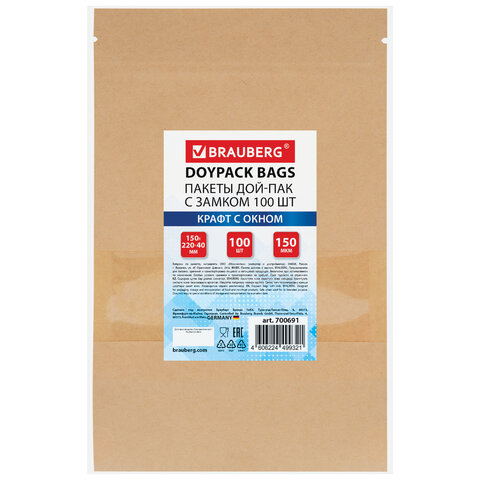 Пакеты дой-пак с замком ZIP LOCK, крафт с окном 50 мм, 150х220 + 40 мм, КОМПЛЕКТ 100 штук, 150 мкм, BRAUBERG, 700691
