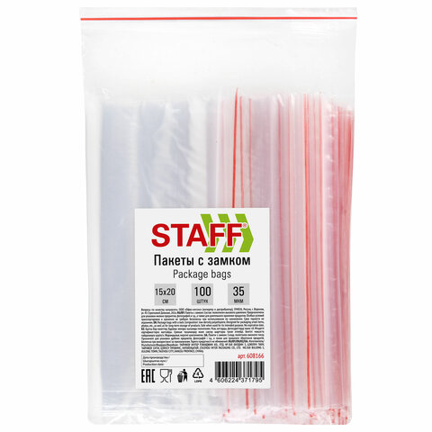 Пакеты с замком ZIP-LOCK "зиплок", комплект 100 шт., 150х200 мм, ПВД, толщина 35 мкм, STAFF, 608166