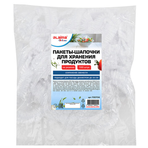 Пакеты-шапочки для хранения продуктов, на резинке диаметром до 38 см, КОМПЛЕКТ 100 штук, LAIMA Home, 700704