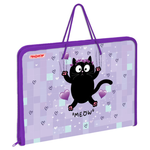 Папка для труда на молнии с ручками ПИФАГОР А4, 1 отделение, пластик, органайзер, "Falling cat", 272226