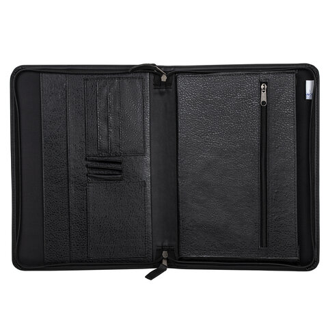 Распашная деловая папка из кожзаменителя на молнии. Одно объемное отделение и два плоских кармана. Дополнительный карман на молнии. Отделения для визиток и письменных принадлежностей.