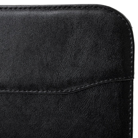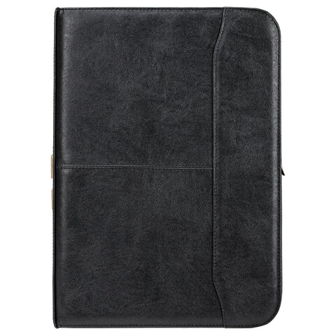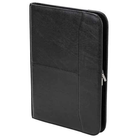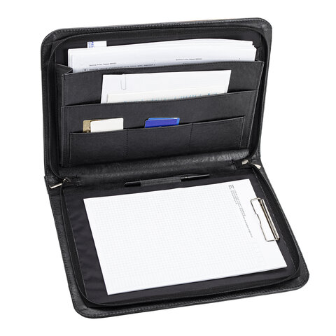 Распашная деловая папка на молнии. Состоит из двух больших карманов для документов. Снабжена металлическим прижимом для бумаг. Дополнительные отделения для визиток и пр.