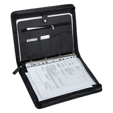 Распашная деловая папка на молнии снабжена объемным карманом на кнопке, плоским карманом на молнии и карманом для блокнота. Дополнительные отделения для визиток и пишущих принадлежностей. 4-кольцевой механизм для перфорированных папок.
