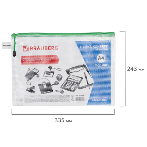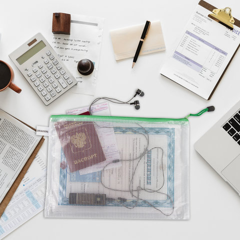 Папка-конверт на молнии А4 (335х243 мм), молния ассорти, ПВХ, сетка, прозрачная, 0,2 мм, BRAUBERG "Segment", 223886