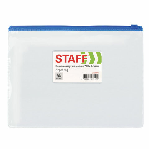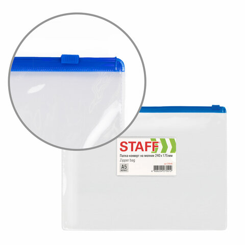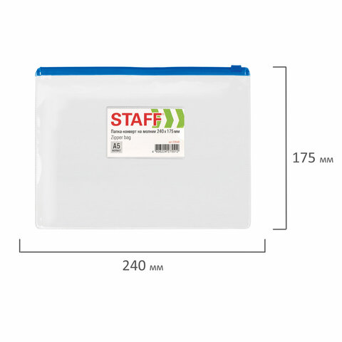 Папка-конверт на молнии МАЛОГО ФОРМАТА (240х175 мм), А5, карман для визиток, прозрачная, 0,12 мм, STAFF, 229548