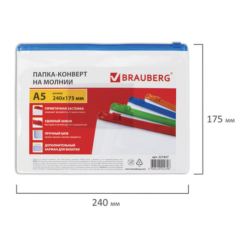 Папка-конверт на молнии МАЛОГО ФОРМАТА (240х175 мм), А5, молния ассорти, 0,15 мм, BRAUBERG "Smart", 221857