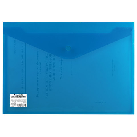Папка-конверт с кнопкой BRAUBERG, А4, до 100 листов, непрозрачная, синяя, СВЕРХПРОЧНАЯ 0,2 мм, 221362
