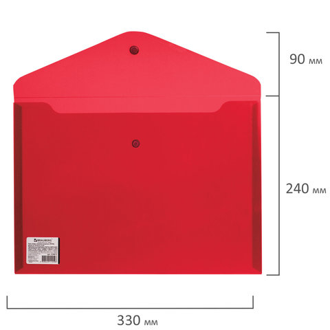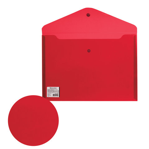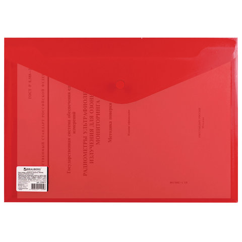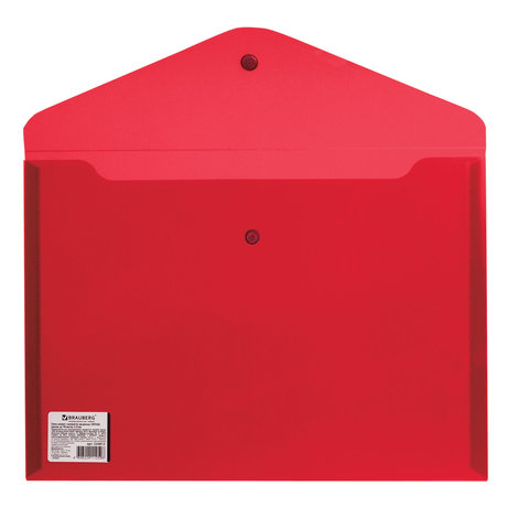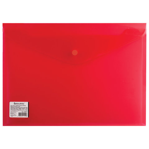 Папка-конверт с кнопкой BRAUBERG, А4, до 100 листов, прозрачная, красная, СВЕРХПРОЧНАЯ 0,18 мм, 224812