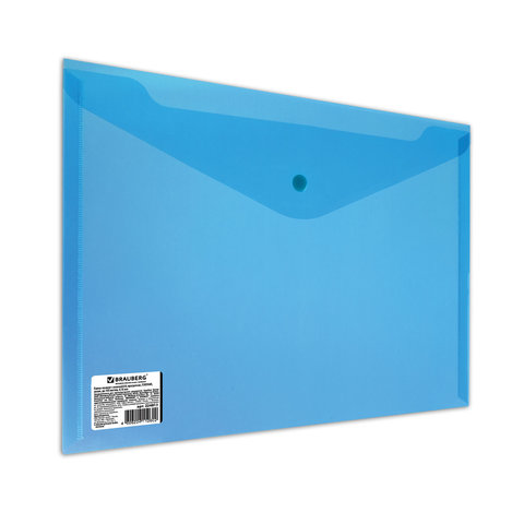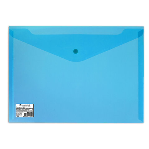 Папка-конверт с кнопкой BRAUBERG, А4, до 100 листов, прозрачная, синяя, СВЕРХПРОЧНАЯ 0,18 мм, 224813