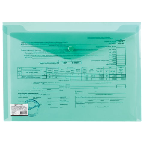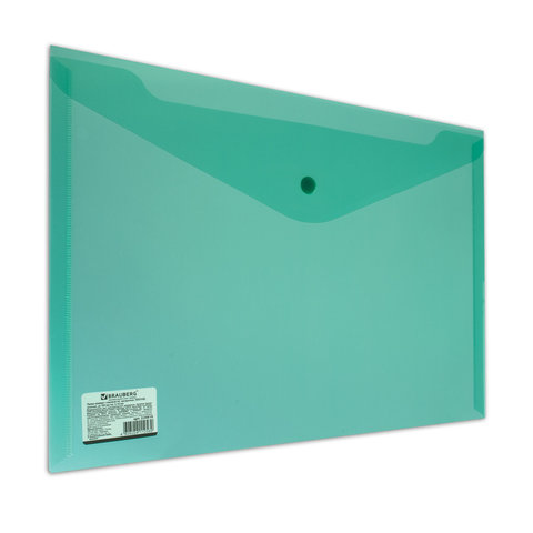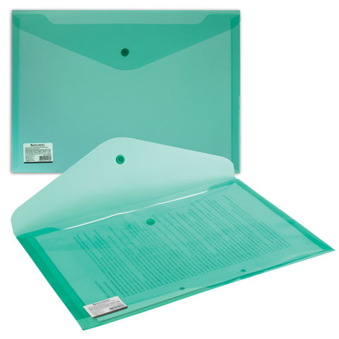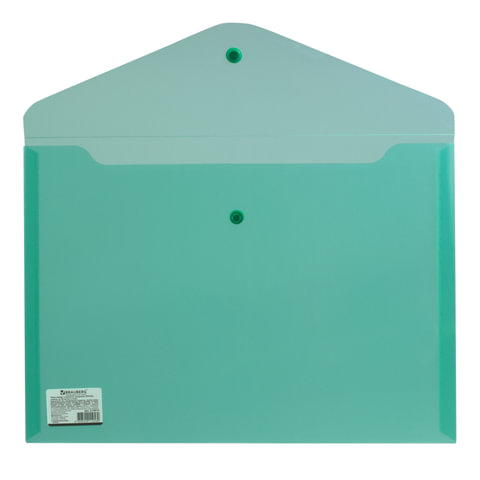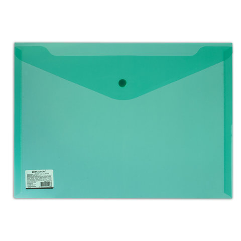 Папка-конверт с кнопкой BRAUBERG, А4, до 100 листов, прозрачная, зеленая, СВЕРХПРОЧНАЯ 0,18 мм, 224810