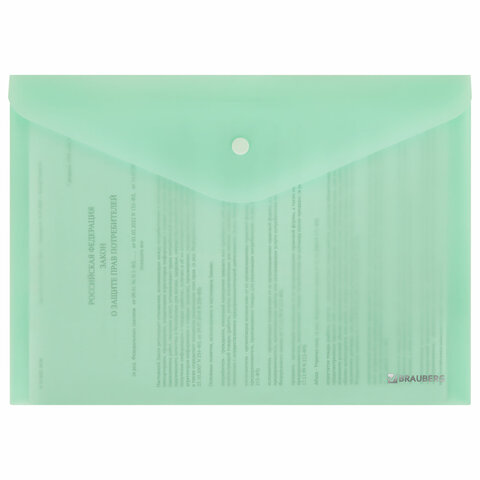 Папка-конверт с кнопкой BRAUBERG "Pastel", А4, матовая непрозрачная, мятная, ПРОЧНАЯ 0,2 мм, 272883