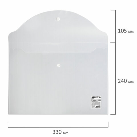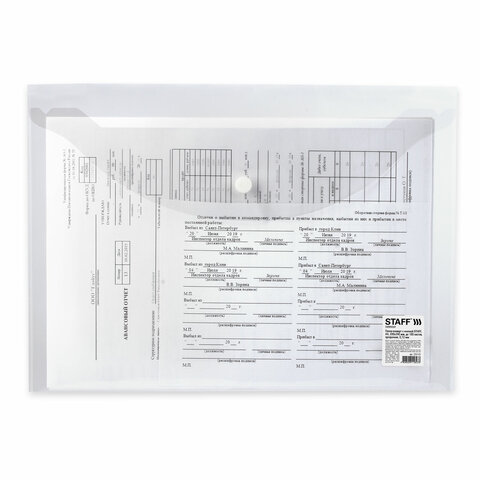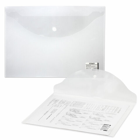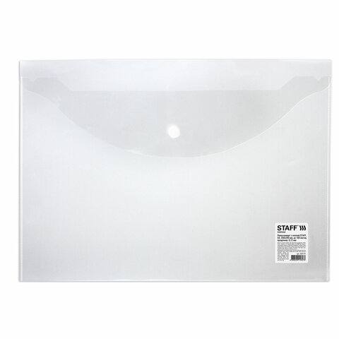 Папка-конверт с кнопкой STAFF, А4, до 100 листов, прозрачная, 0,12 мм, 225173