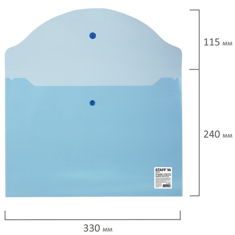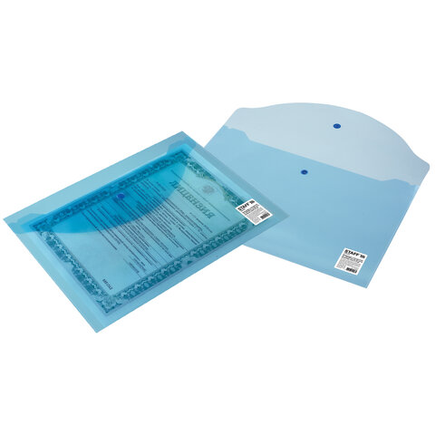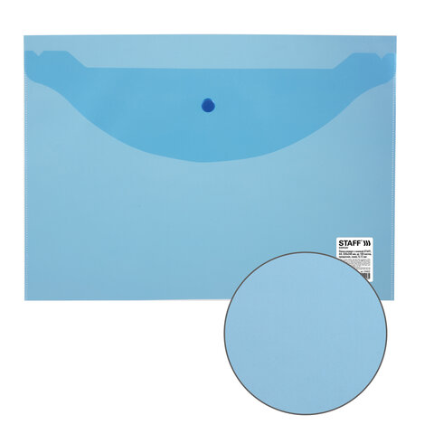 Папка-конверт с кнопкой STAFF, А4, до 100 листов, прозрачная, синяя, 0,12 мм, 224623