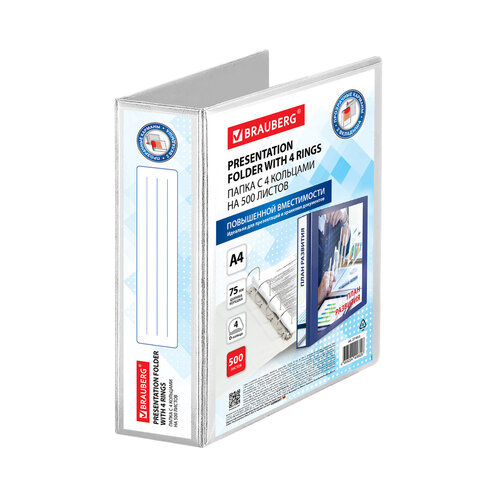Папка ПАНОРАМА на 4 кольцах, ПРОЧНАЯ, картон/ПВХ, BRAUBERG "Office", БЕЛАЯ, 75 мм, до 500 листов, 271853