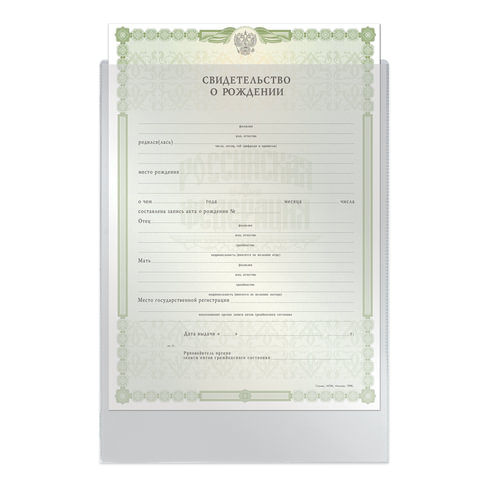 Папка-файл для свидетельства о рождении без перфорации. Предназначена для защиты документов от внешних воздействий.