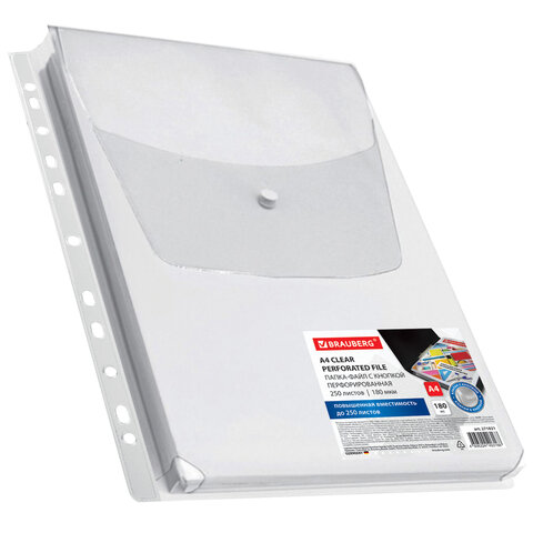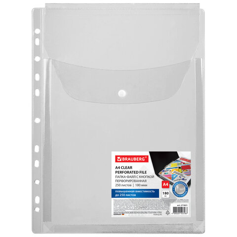 Папка-файл с перфорацией 1 штука с кнопкой БОЛЬШОЙ ВМЕСТИМОСТИ до 250 л., ПВХ 180 мкм, BRAUBERG, 271831