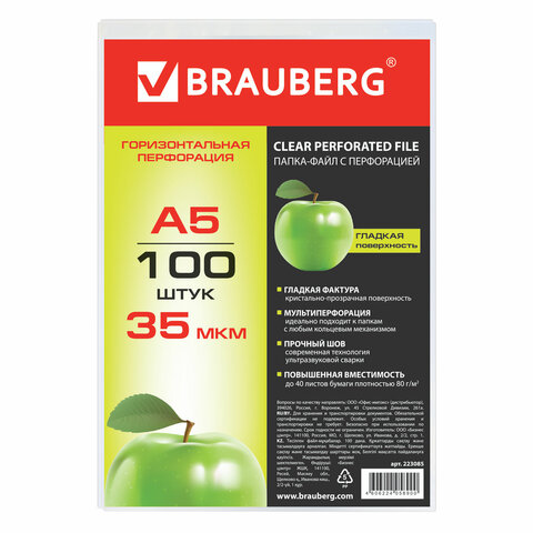 Перфорированные папки-файлы BRAUBERG предназначены для хранения документов и подходят для подшивки в папки с любым кольцевым механизмом и скоросшивателем.