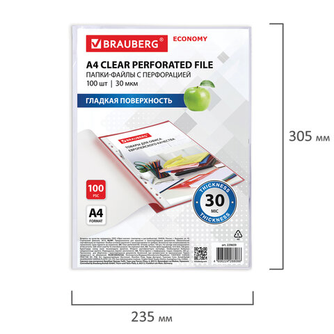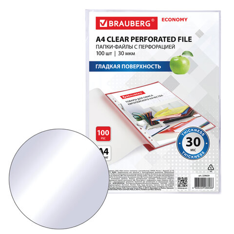 Папки-файлы перфорированные А4 BRAUBERG "ECONOMY", КОМПЛЕКТ 100 шт., гладкие, 30 мкм, 229659
