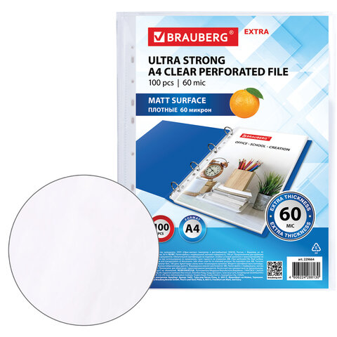 Папки-файлы перфорированные А4 BRAUBERG "МАТОВЫЕ EXTRA 600", КОМПЛЕКТ 100 шт., ПЛОТНЫЕ, 60 мкм, 229664