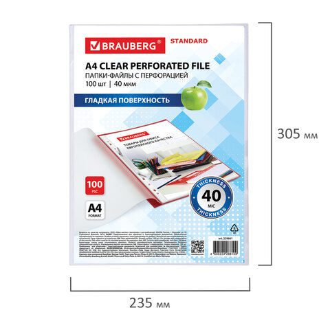 Перфорированные папки-файлы BRAUBERG "STANDARD" предназначены для хранения документов в папке с любым кольцевым механизмом или скоросшивателем.