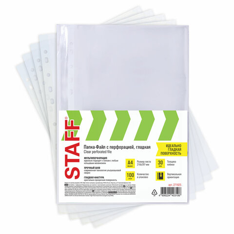 Папки-файлы перфорированные, А4, STAFF "ЭКОНОМ", КОМПЛЕКТ 100 шт., гладкие, 30 мкм, 271825