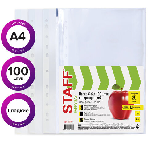 Папки-файлы перфорированные, А4, STAFF "STANDARD", КОМПЛЕКТ 100 шт., гладкие, 25 мкм, 224814