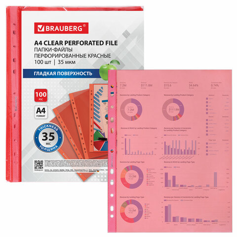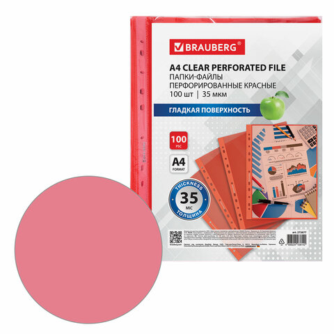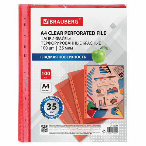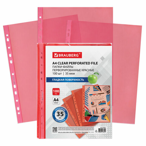 Папки-файлы перфорированные КРАСНЫЕ А4 BRAUBERG, комплект 100 шт., гладкие, 35 мкм, 272677