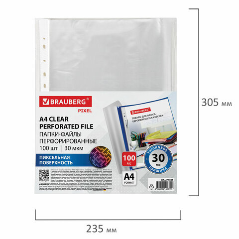 Папки-файлы перфорированные с антибликовой текстурой А4 BRAUBERG PIXEL, КОМПЛЕКТ 100 шт., 30 мкм, 271826