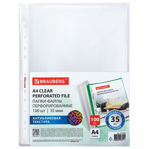 Перфорированные папки-файлы BRAUBERG предназначены для хранения и защиты бумажных документов от загрязнения и механических повреждений.