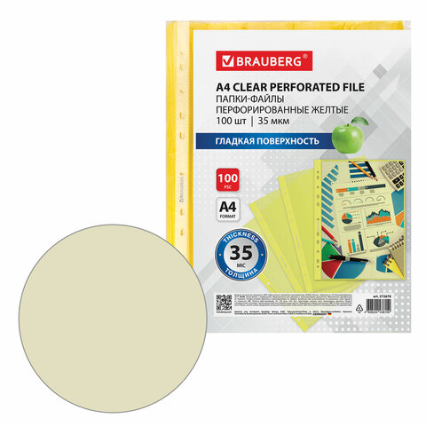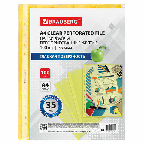 Папки-файлы перфорированные ЖЕЛТЫЕ А4 BRAUBERG, комплект 100 шт., гладкие, 35 мкм, 272678