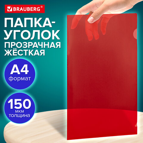 Папка-уголок жесткая прозрачная А4 BRAUBERG UNIVERSAL, красная, 0,15 мм, со штрихкодом, 273052