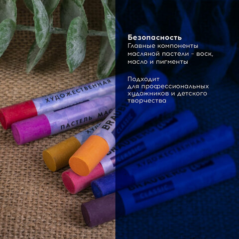Масляная художественная пастель BRAUBERG ART "CLASSIC" отличается мягкой консистенцией и интенсивной маслянистой цветовой палитрой. Пастель не пачкается, тем самым законченные рисунки труднее смазать, и они не требуют дополнительной фиксации.
