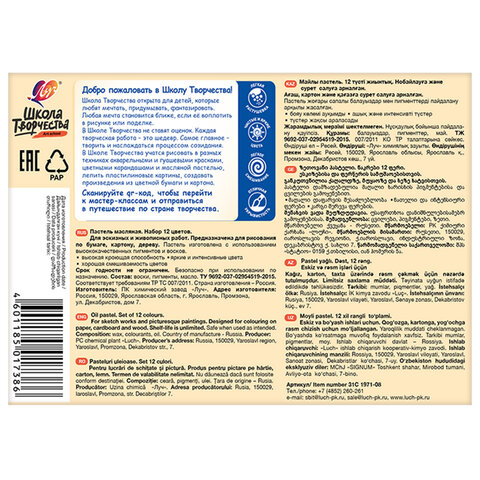 Пастель масляная ЛУЧ "Школа творчества", 12 цветов, трехгранная, картонная упаковка, 31С 1971-08