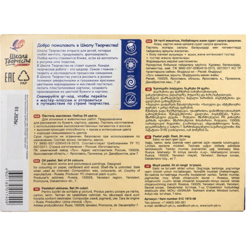 Пастель масляная ЛУЧ "Школа творчества", 24 цвета, трехгранная, картонная упаковка, 31С 1973-08